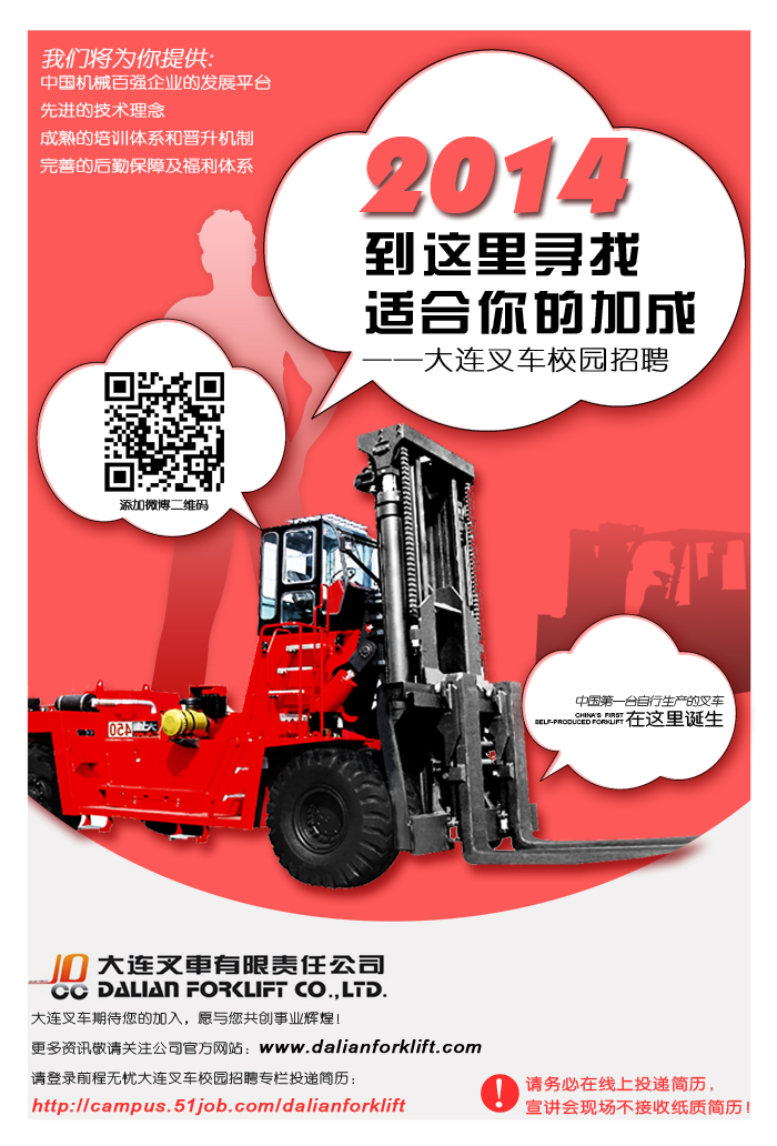 大連叉車2014年校園招聘將于9月16日正式啟幕,本次校園招聘將在大連理工大學(xué)、東北大學(xué)、哈爾濱工程大學(xué)召開現(xiàn)場宣講會,誠邀莘莘學(xué)子屆時參加!