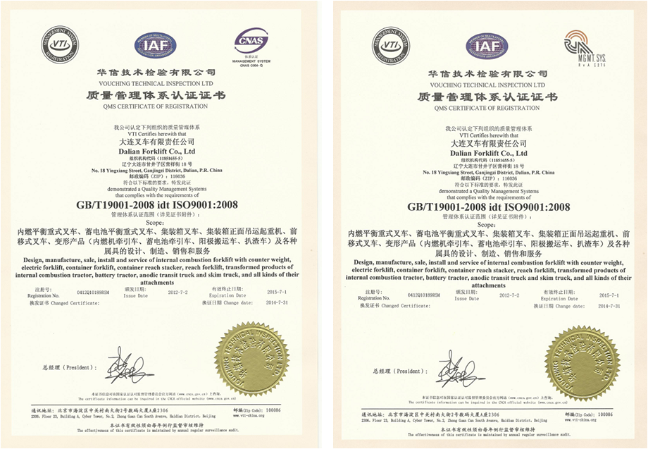 經(jīng)評(píng)審,按照GB/T19001-2008 idt ISO9001:2008標(biāo)準(zhǔn)的要求,公司質(zhì)量管理體系順利通過(guò)審核。在本次審核過(guò)程中,對(duì)公司質(zhì)量體系覆蓋范圍進(jìn)行了擴(kuò)容,增加了前移式叉車(chē),規(guī)格型號(hào)為CQD20型(2.0t及以下)。